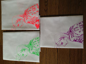 今回は、きのうシルクスクリーンを印刷する会に参加させていただいたので、「蓬ガ原で」に登場するヤンキーの手拭いを作りました。これらは千円です。あと無花果のキーホルダがちょっとと心臓の磁石があります。