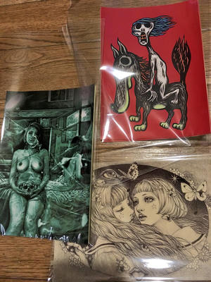 今回は、きのうシルクスクリーンを印刷する会に参加させていただいたので、「蓬ガ原で」に登場するヤンキーの手拭いを作りました。これらは千円です。あと無花果のキーホルダがちょっとと心臓の磁石があります。