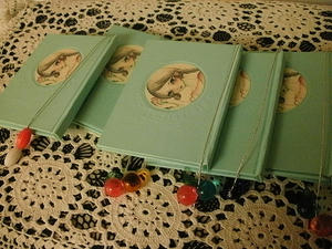 鳥のいる絵を集めて作りました。銀のひもに古いかわいいビーズをつけ背と表紙