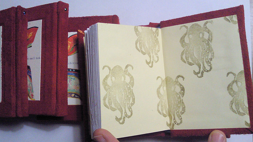 見開きの金の蛸の模様の紙は消しゴムはんで作りました